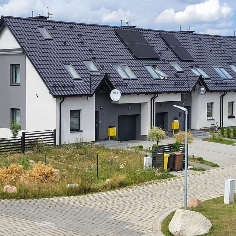 Pokoje: I piętrowy dom składa się z salonu z aneksem kuchennym, wyjściem do ogrodu oraz łazienki. Na piętrze znajdują się 3 pokoje, garderoba, wyjście na strych oraz duża łazienka z prysznicem oraz wanną.