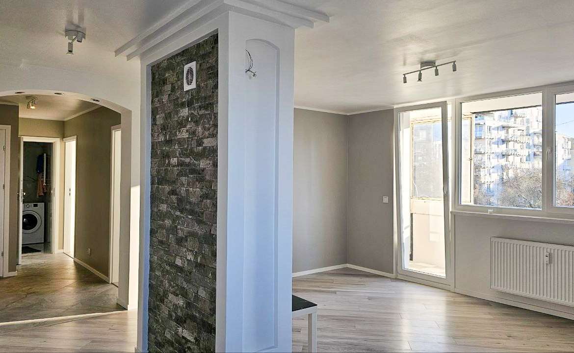 Он состоит из светлой гостиной с выходом на балкон, двух комнат и открытой кухни. В квартире сделан капитальный ремонт: штукатурка на стенах, стены покрашены краской Joutun, деревянные рейки, стяжка на полах, виниловые панели, новая медная установка.