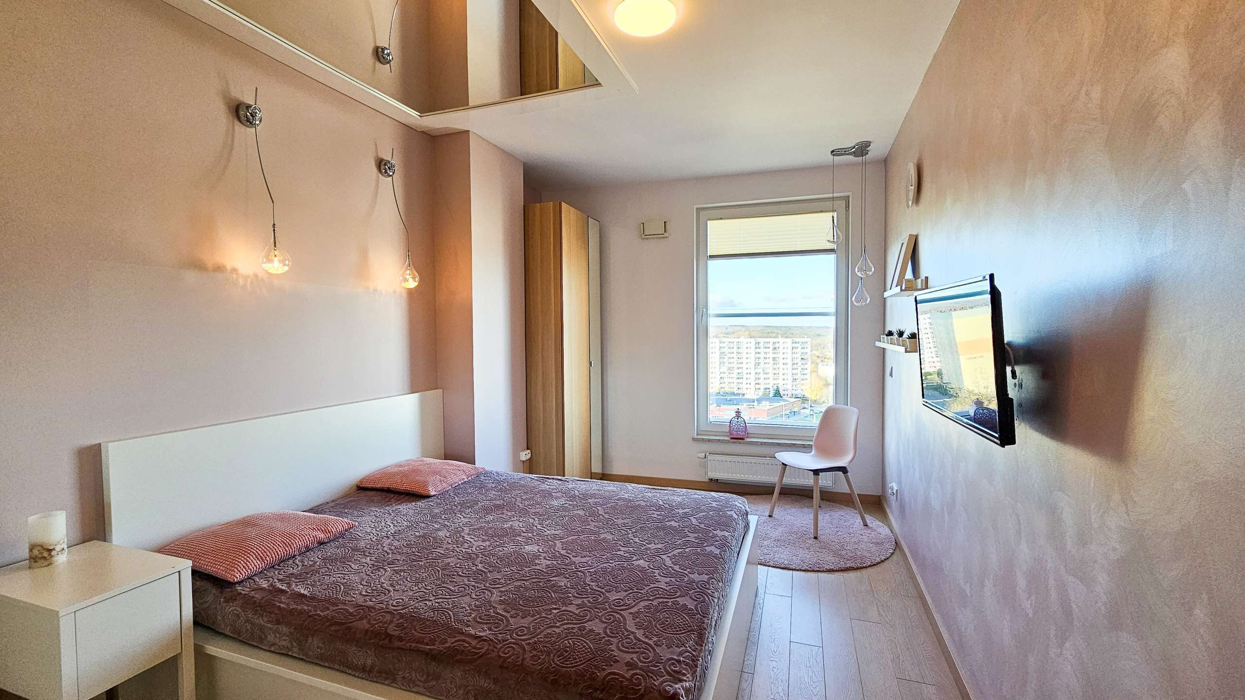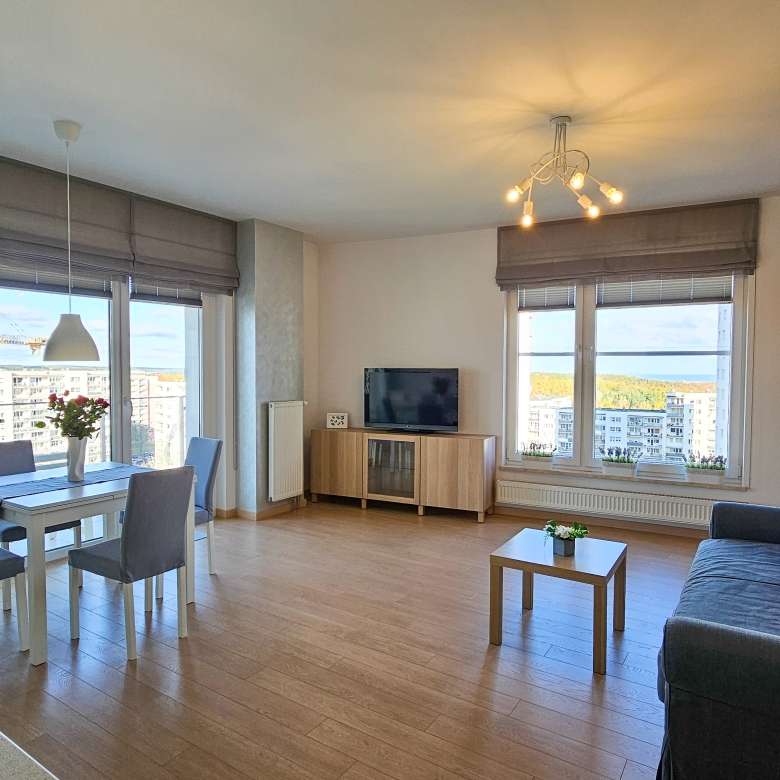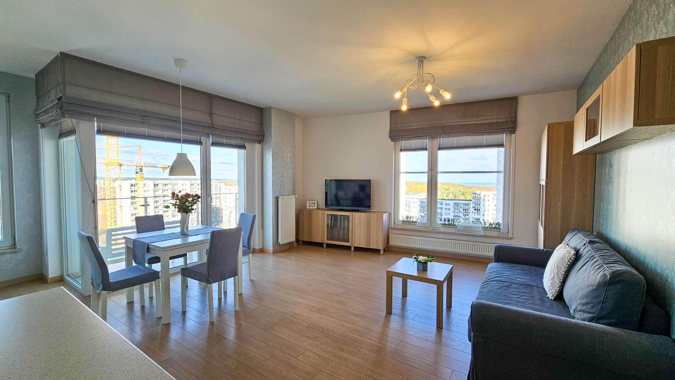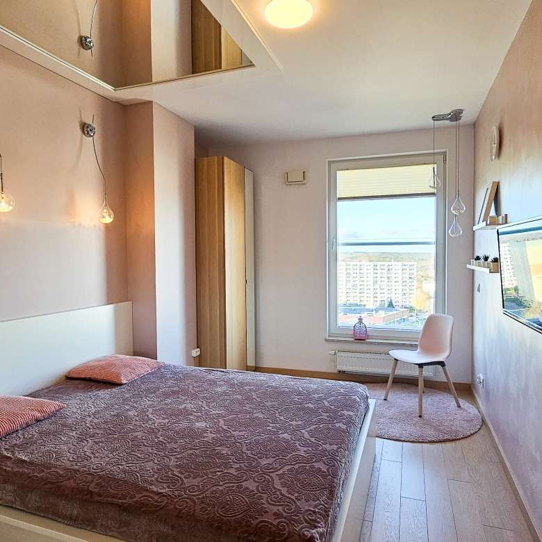 Из этой квартиры на 11 этаже открывается потрясающий вид на городской пейзаж, море и полуостров Хель – вид настолько красивый, что хочется просыпаться к жизни здесь каждый день!