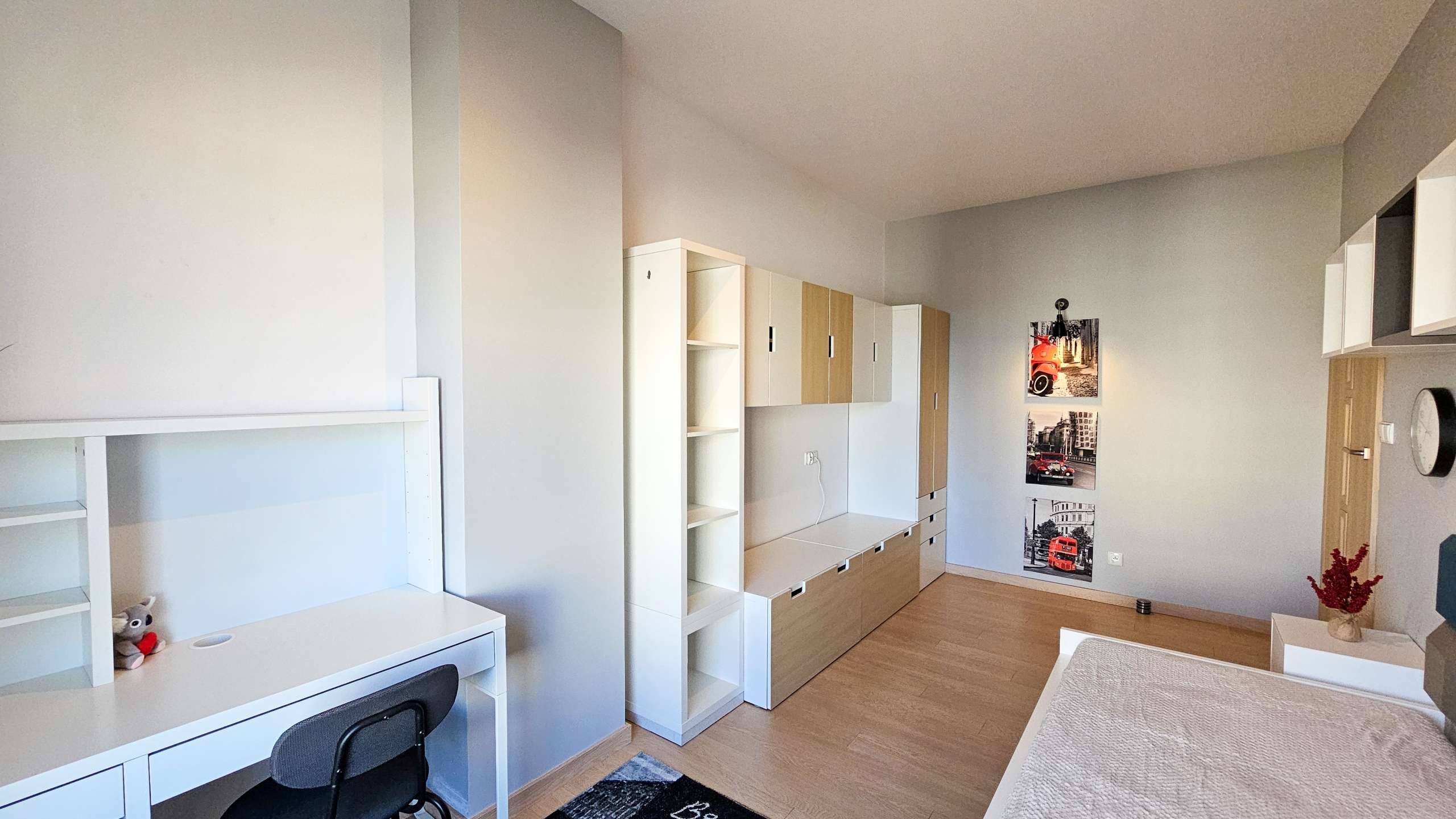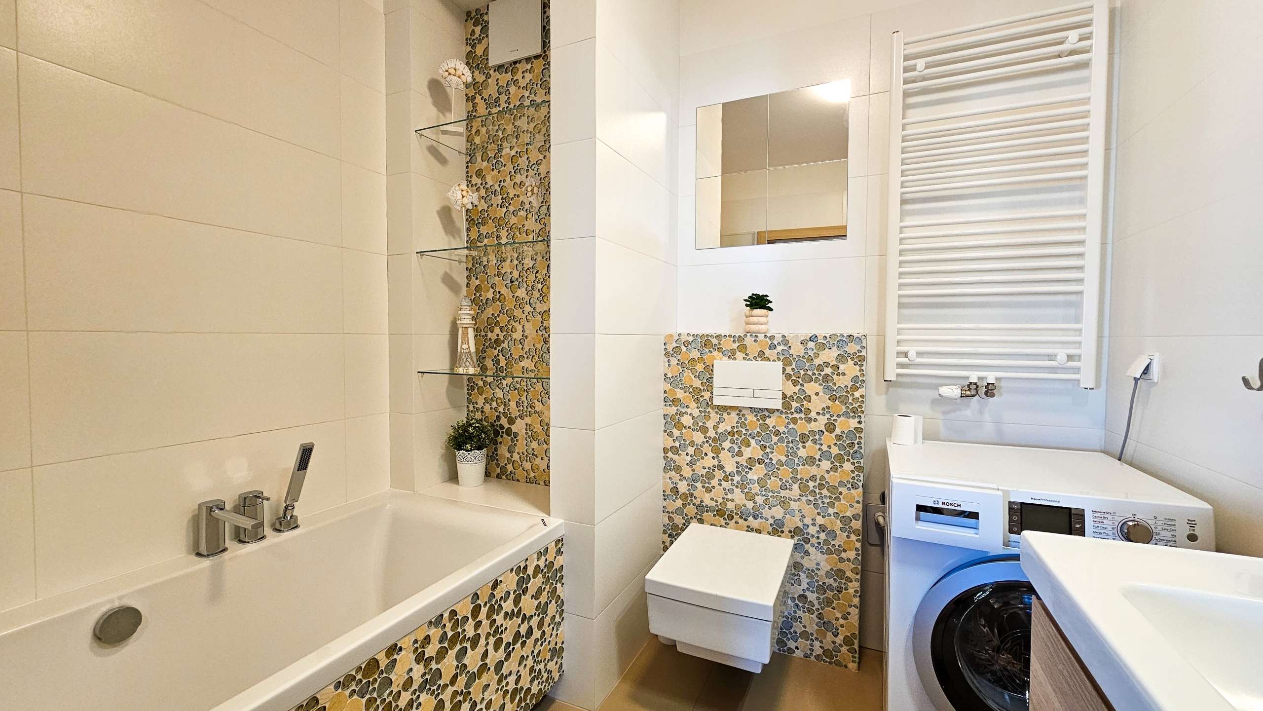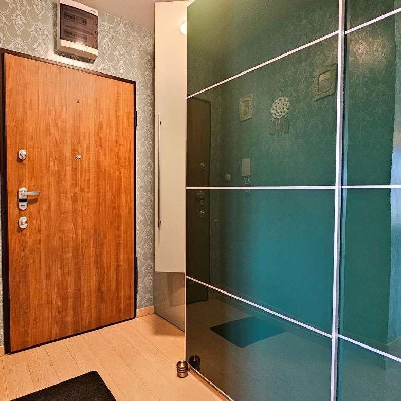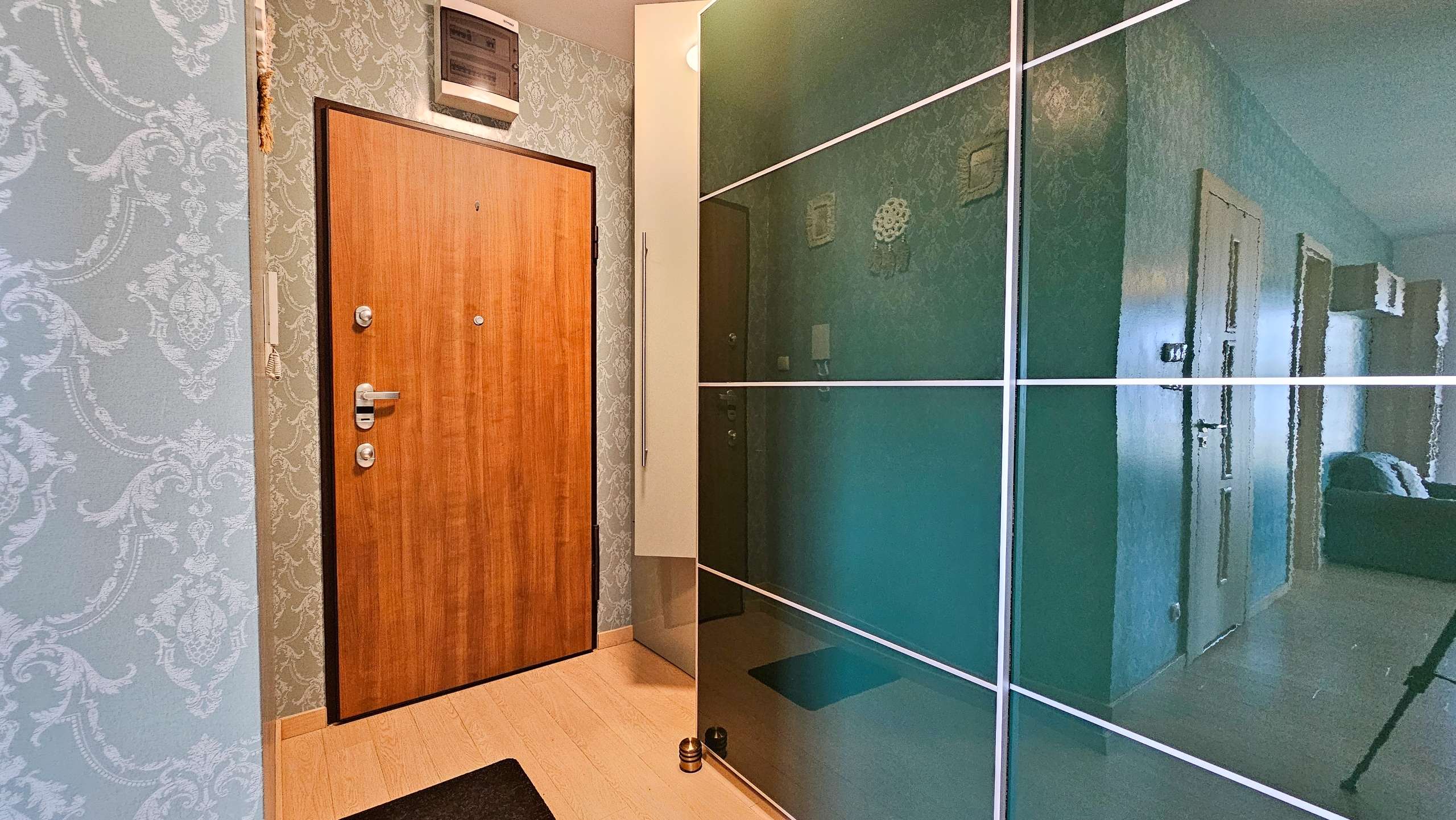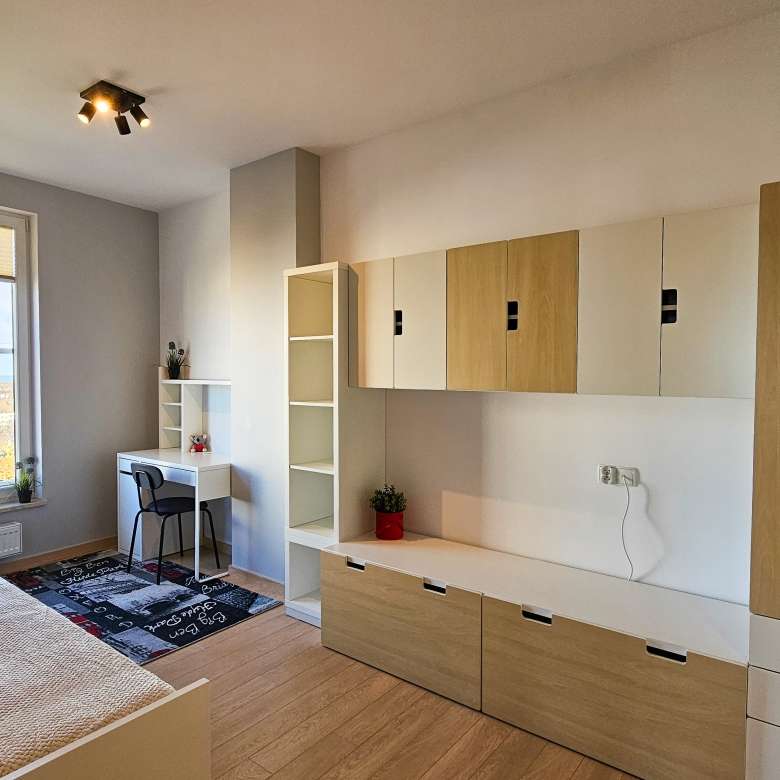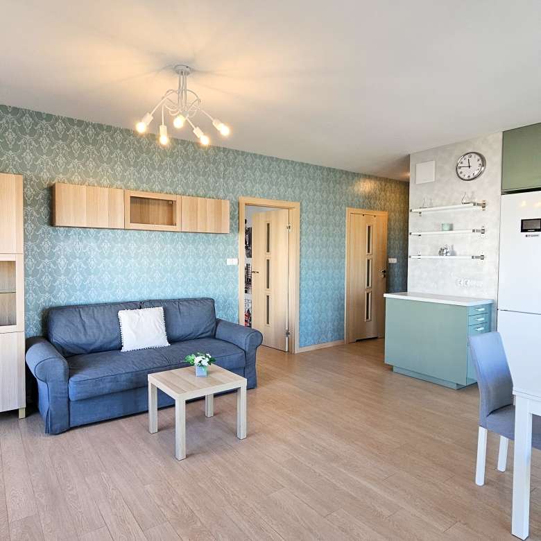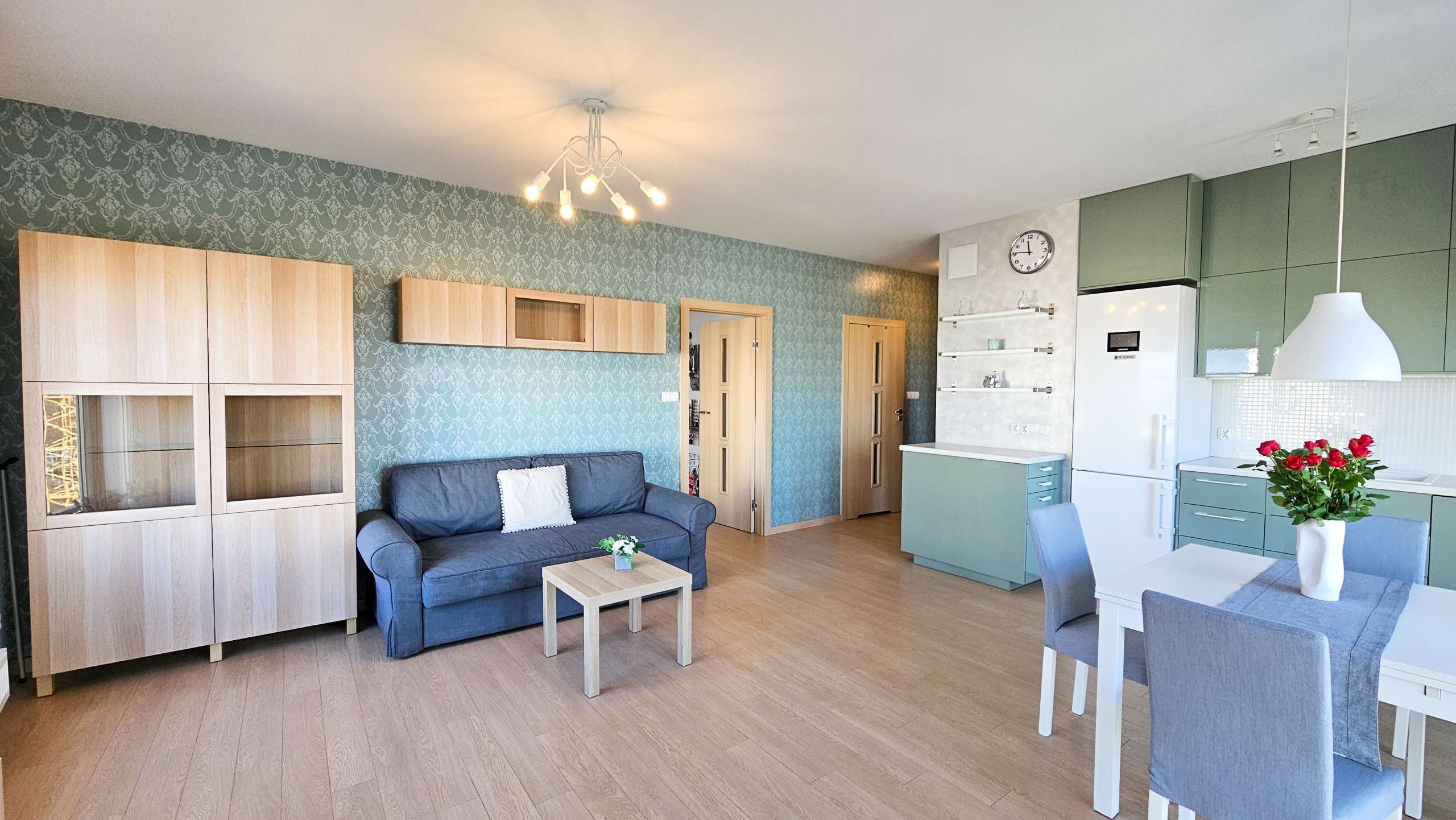 Планировка: Просторная гостиная с кухней (более 30 м²), две отдельные спальни, большая ванная комната с ванной и стиральной машиной-сушилкой и прихожая с полноценными шкафами.
