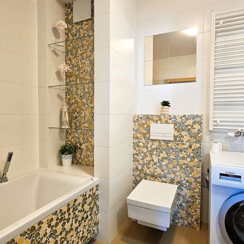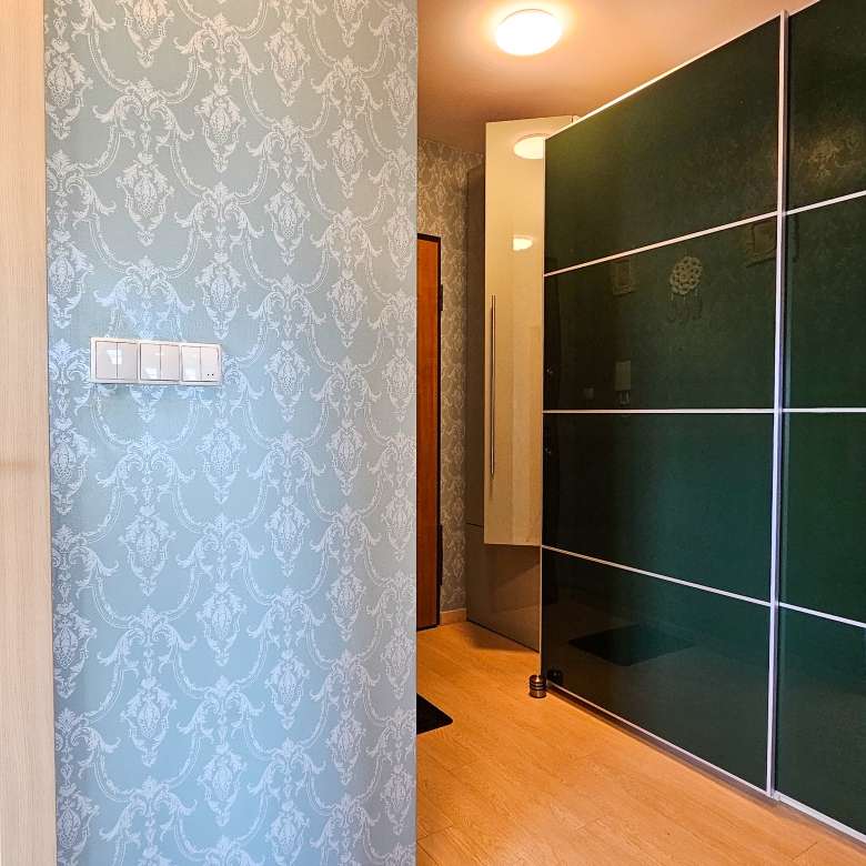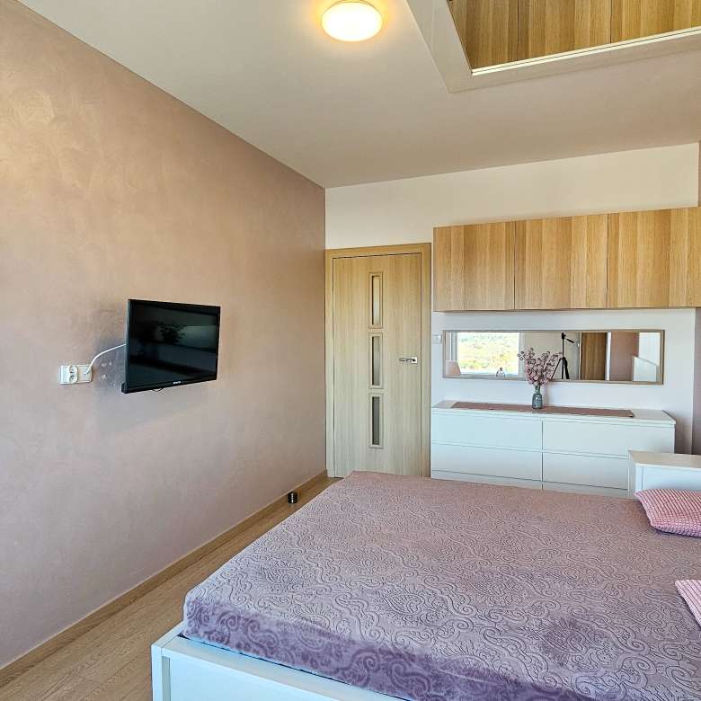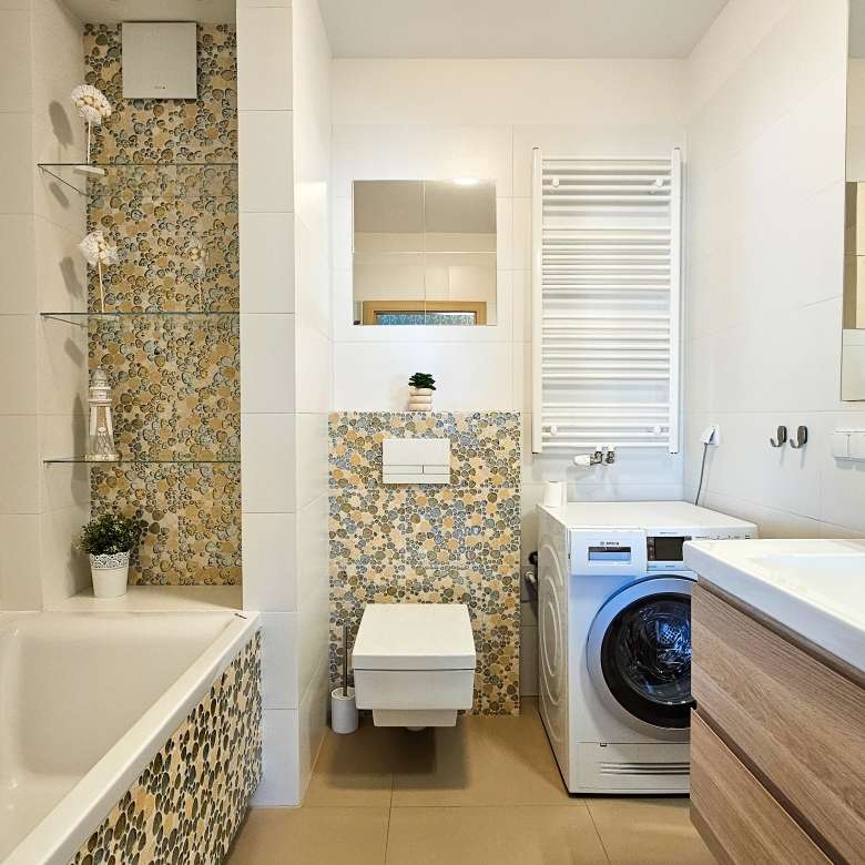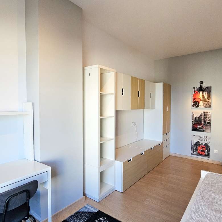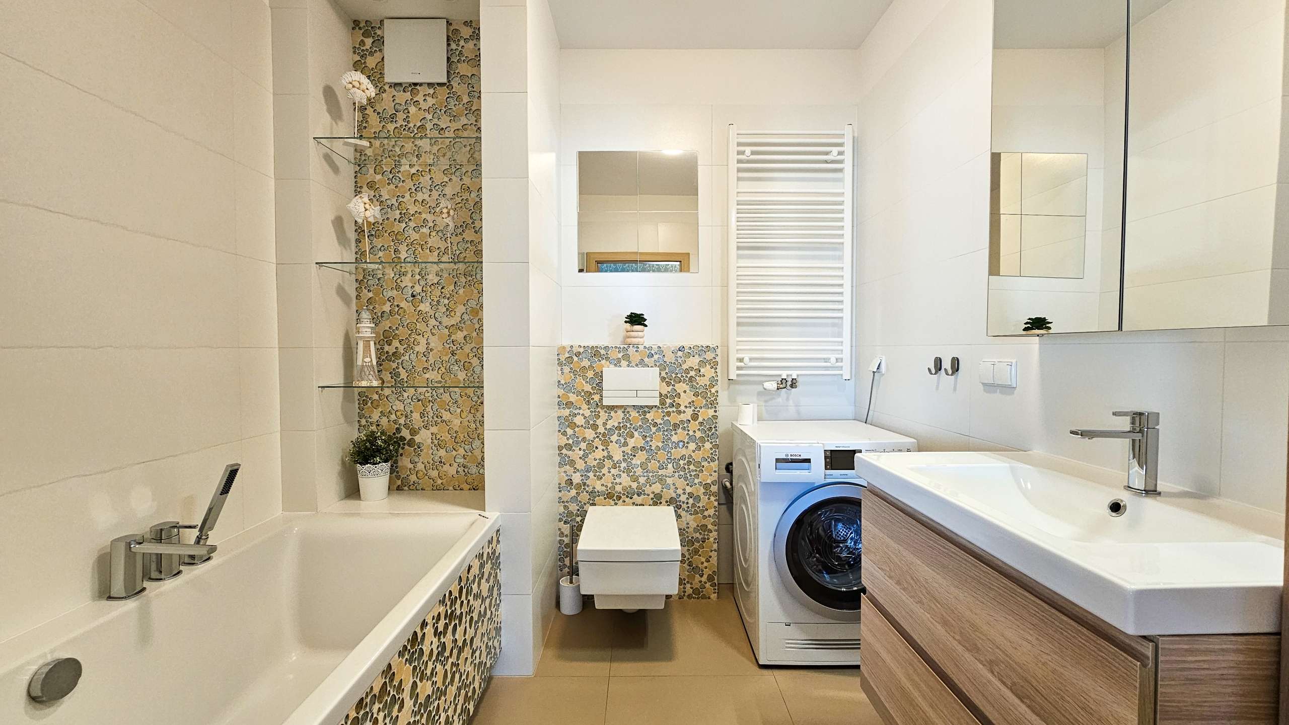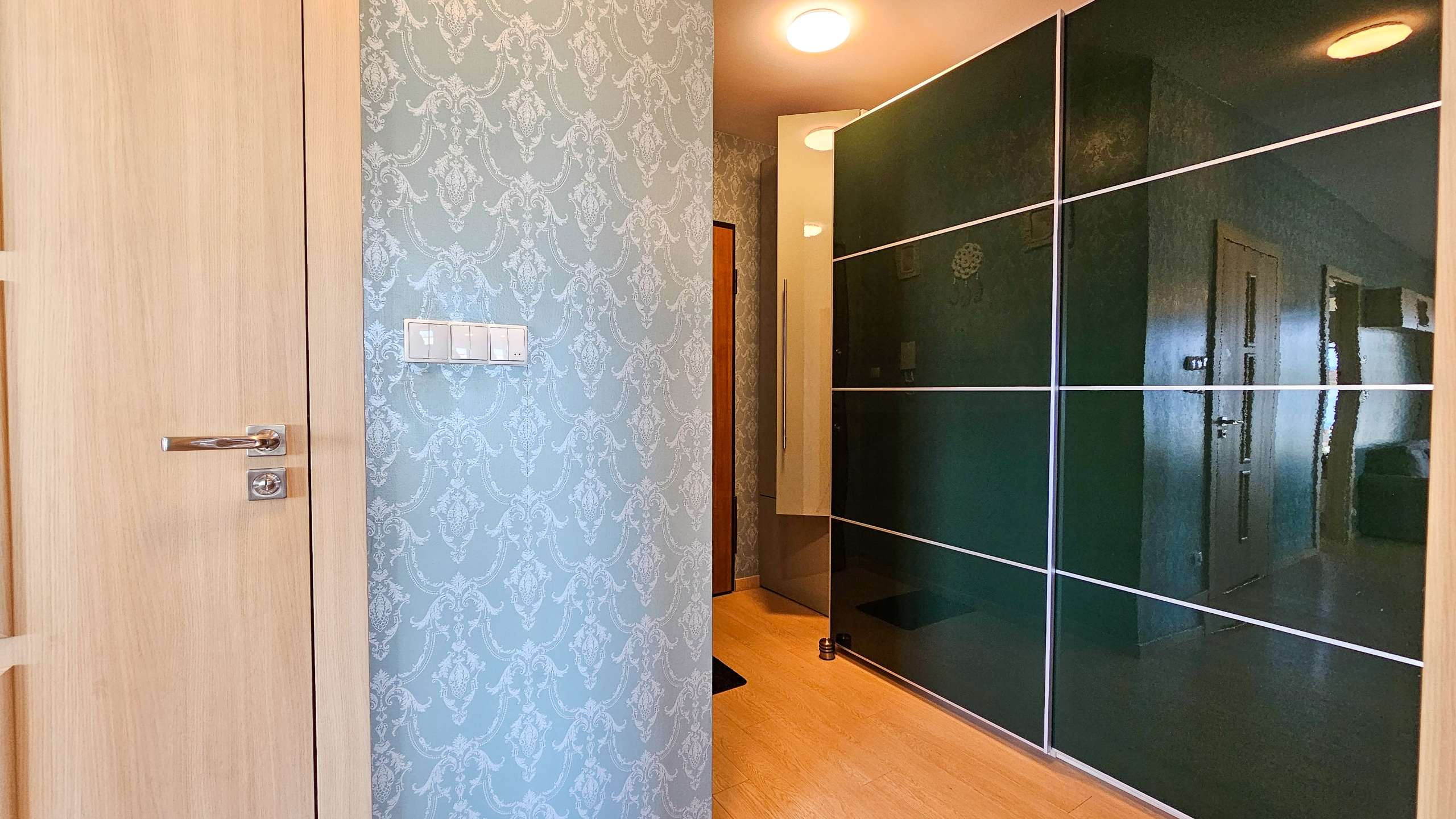 Планировка: Просторная гостиная с кухней (более 30 м²), две отдельные спальни, большая ванная комната с ванной и стиральной машиной-сушилкой и прихожая с полноценными шкафами.