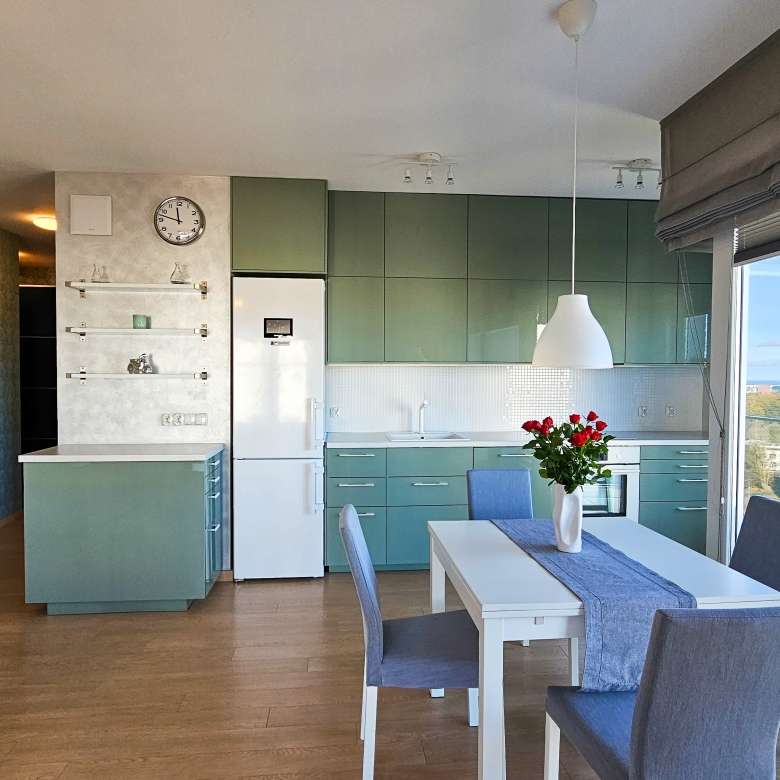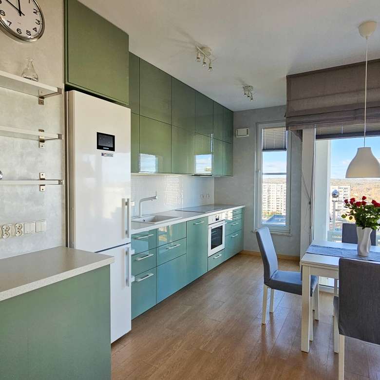 Кухня: Мини-кухня идеально подходит для людей, которые ценят современные решения с высококачественной бытовой техникой, m.in. умный холодильник, посудомоечную машину, индукционную плиту с духовым шкафом и вытяжкой.